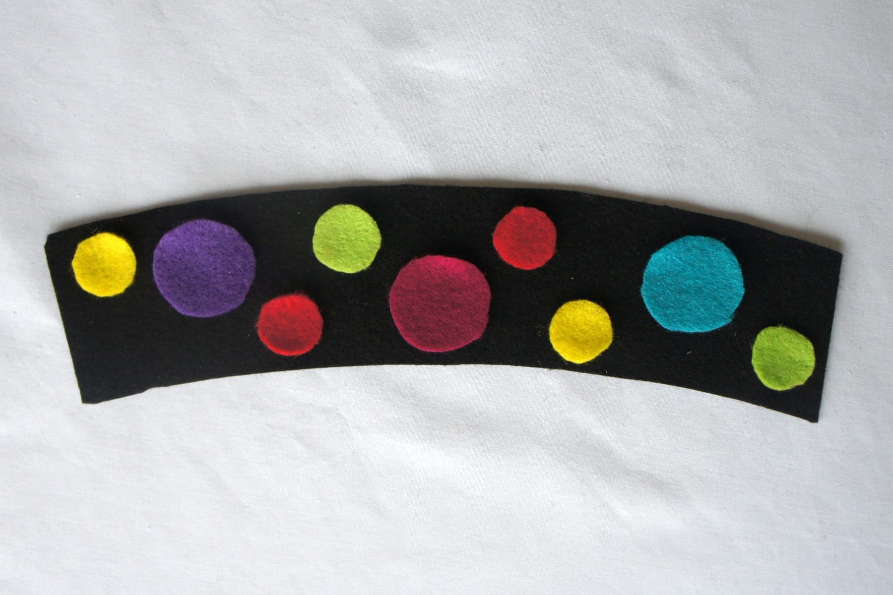 I positioned the circles on my black felt curve to find how I was going to arrange them, then sewed them on with matching embroidery thread. Seriously simple!