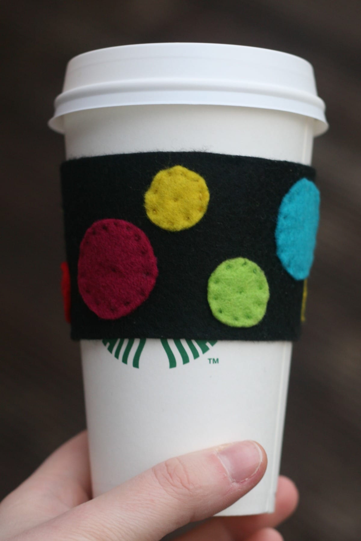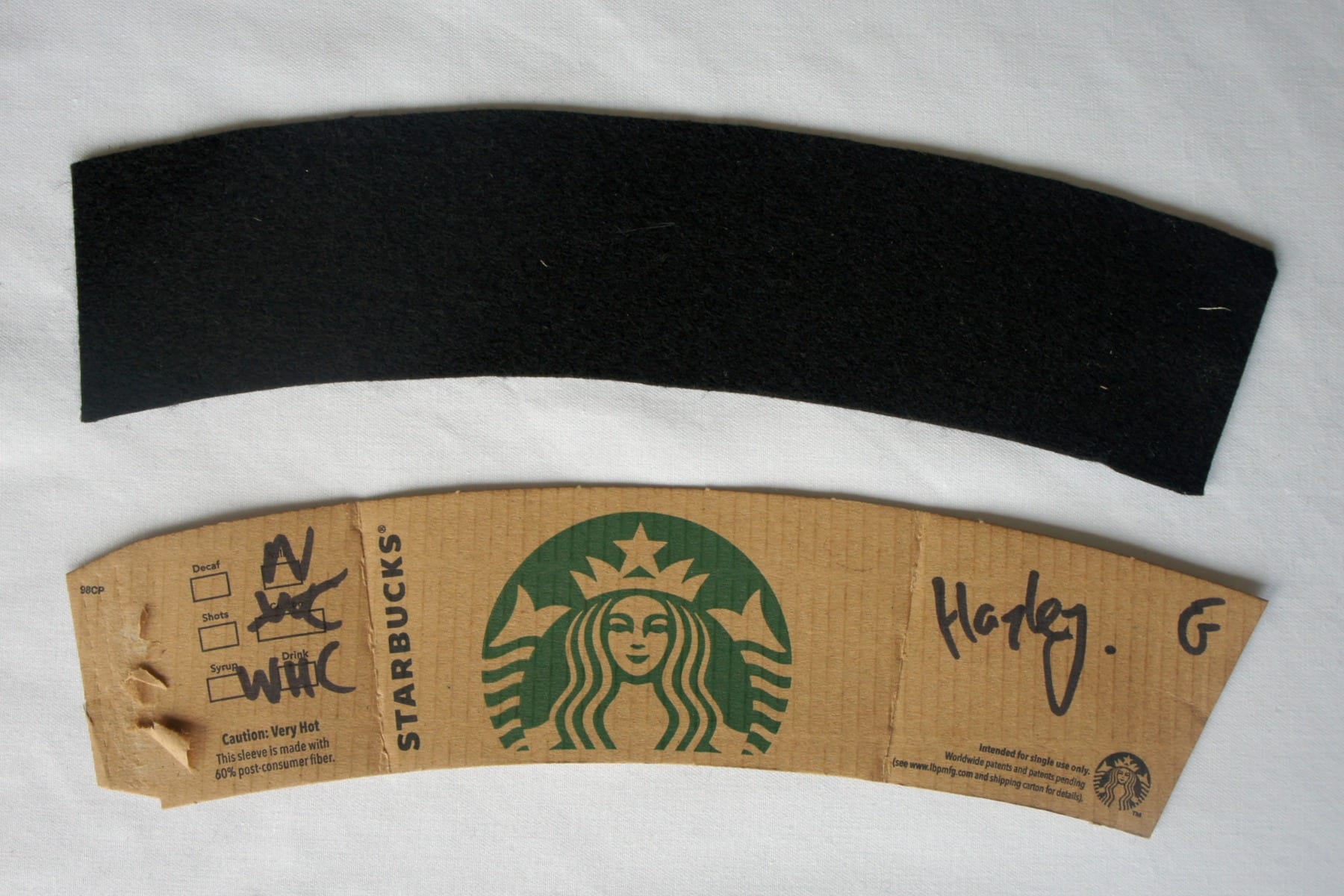 I took a cardboard sleeve, undid it (carefully so I didn’t lose the shape!) and traced it onto some black felt. I cut it out, and made sure it would still go around my cup. (See? SEE? That’s how bloody stupid my order is.)